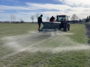 Teraz przyszedł czas na renowację murawy. Po zimowych miesiącach nawierzchnia wymagała regeneracji, dlatego rozpoczęto zabiegi pielęgnacyjne, w tym aerację i dosiew trawy. Wszystko po to, aby boisko było w jak najlepszym stanie przed nadchodzącymi meczami.