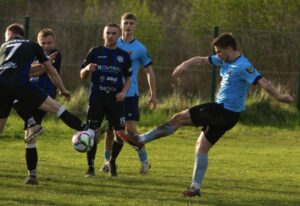 „Mecz zaczął się dosyć ambitnie z naszej strony – przez kilka minut oblegaliśmy bramkę przeciwnika, który skutecznie się bronił. Stwarzaliśmy dogodne sytuacje po odbiorach w środku pola, posyłając piłki na skrzydła, gdzie próbowaliśmy wrzucać je w pole karne przeciwnika. Niestety, po niedokładnym dośrodkowaniu przeciwnik wyprowadza kontratak, a w sytuacji sam na sam tracimy bramkę na 0:1. Próbujemy odrobić straty i wciąż stwarzamy okazje, ale brakuje nam skutecznego wykończenia. Chwilę później napastnik gości upada w polu karnym w kontrowersyjnych okolicznościach, jednak sędzia nie używa gwizdka. Z tej sytuacji wychodzimy z kontrą, a Kuba Konefał doprowadza do wyrównania. Jeszcze przed końcem pierwszej połowy nasz kapitan ma dogodną sytuację po podaniu ze środka pola, ale po zamieszaniu akcję kończymy bez strzału. Schodzimy na przerwę z wynikiem 1:1.