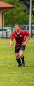 Za nami dość ciężki mecz, nasza gra od pierwszych minut nie wyglądała tak jak trener od nas oczekiwał, wkradło się dość dużo błędów. Jednak cały czas walczyliśmy i pokazywaliśmy, że chcemy wygrać ten mecz, stwarzając to kolejne sytuacje pod bramką przeciwnika. Niestety w 50-tej minucie meczu nasz bramkarz dostaje dość kontrowersyjną czerwoną kartkę i przy wyniku 1:1 zostajemy w dziesiątkę a ja osobiście ubieram rękawice i staje na bramkę. Na szczęście nasz obrona funkcjonowała prawidłowo, dzięki czemu zdołaliśmy wyprowadzać skuteczne kontry i strzelamy 2 kolejne bramki dla naszego zespołu. Jak dla mnie nie był to najlepszy mecz w naszym wykonaniu, ale na murawie zostawiliśmy serce co zaowocowało na wynik 3:2 dla naszego zespołu.