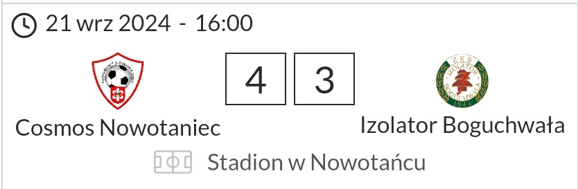 „Z piekła do nieba – tak w skrócie bym podsumował to spotkanie. Pierwsza połowa do zapomnienia, słaba gra z naszej strony, duże luki w środku pola, co Izolator dobrze wykorzystał i prowadził z nami 2:0 do przerwy. W drugiej połowie mogliśmy zobaczyć odmienioną drużynę Cosmosu, która po kilku motywujących słowach trenera oraz prezesa w szatni uwierzyła w zwycięstwo, co poskutkowało szybkim wyrównaniem, a następnie wygraną w meczu.” – Krystian Kalemba, zawodnik Cosmosu Nowotaniec.