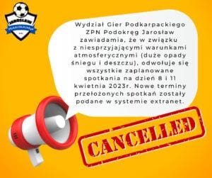 Wydział Gier Podkarpackiego ZPN Podokręg Jarosław zawiadamia, że w związku z niesprzyjającymi warunkami atmosferycznymi (duże opady śniegu i deszczu), odwołuje się wszystkie zaplanowane spotkania na dzień 8 i 11 kwietnia 2023r.